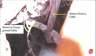 The trucking company in this case asked me to inspect other trucks at their facility. In nearly every case, the visible inspection of the cable insulation would have passed a routine preventative maintenance inspection, as the visible insulation was in good condition. However, closer inspection at the contact point between the positive cable and ground cable identified several instances of severely damaged insulation.